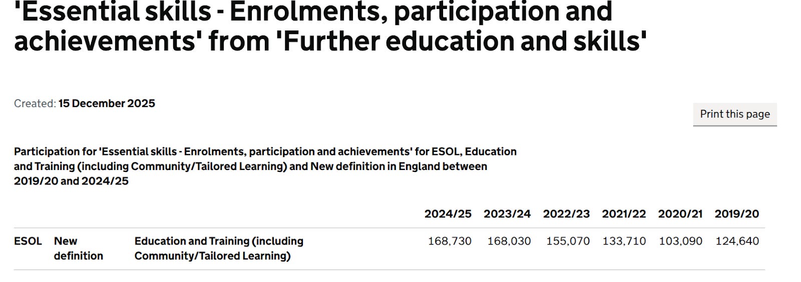 The number of migrants enrolled on taxpayer-funded ESOL has increased to 168,730 in 2024/25.
