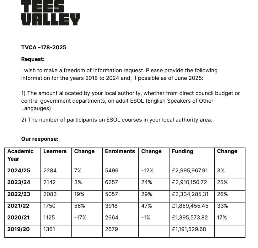 The data shows that since 2018/2019 the Department for Education has spent £347m in funding for ESOL.