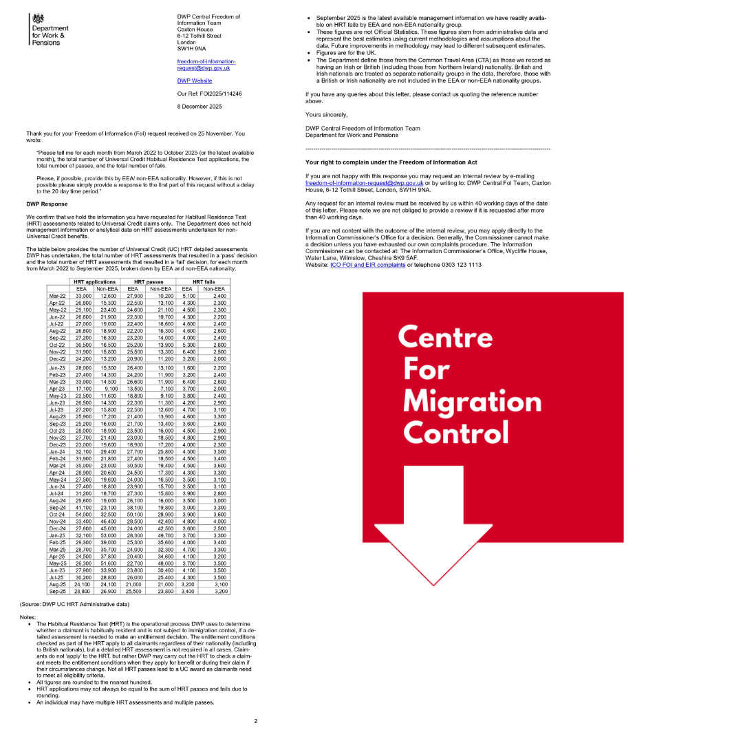 New research by the Centre for Migration Control shows an explosion in the number of foreign nationals passing the ‘Habitual Residency Test’ (HRT) - a prerequisite for those looking to claim Universal Credit.