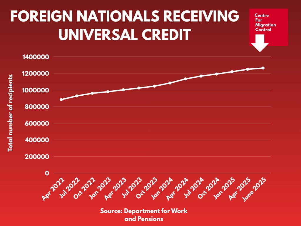 It was revealed that, in June 2025, there were 1.26m foreign nationals claiming Universal Credit, having risen from 883,000 in 2022.
