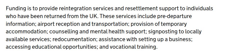 The Home Office states that it has a responsibility to undertake this reintegration support due to Objective 21 of the United Nations’ Objective 21 of the Global Compact for Safe, Orderly and Regular Migration, a deal that Britain was dragged into by Theresa May. The deal requires Britain to reduce the burden on receiving states and to help support the needs of individuals.
