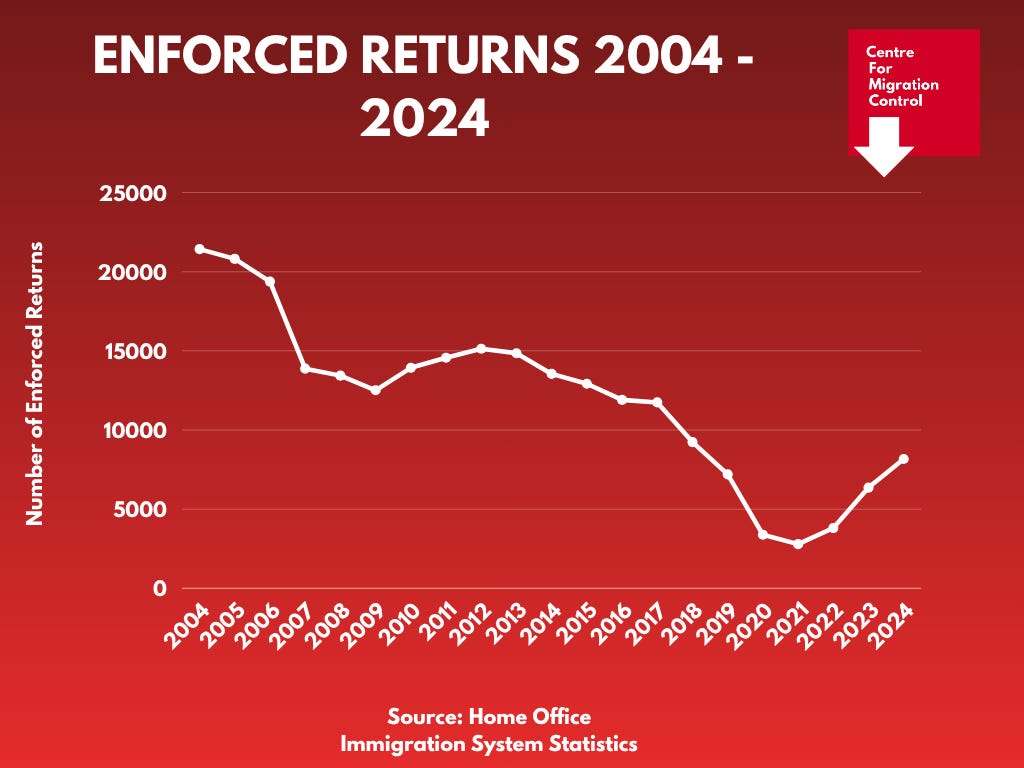 The number of actual deportations taking place has plummeted in recent years. In 2004, there were 21,425 enforced returns. By 2024, this had fallen to just 8,169, with a nadir during the period of 2020-2022 due to Covid.