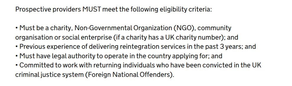 It is made very clear that “the programme supports voluntary and enforced individuals returning from the United Kingdom (UK), including those returning from the community and Foreign National Offenders.”