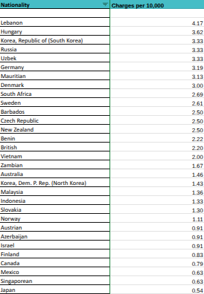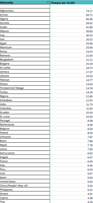 The league tables below show the charge rate, per 10,000, for each nationality between the years 2018 and 2024.