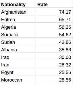 In 2024, there were 1,601 arrests which led to further action being taken. 597 of these were of foreign nationals, 149 were “unknown”, and 855 were British nationals. If we remove unknown nationalities from the equation, then 41% of all charges for sexual offence were foreign nationals. However, if we assume that a significant proportion of those whose nationality could not be identified we foreign nationals, then up to 47% of charges last year were laid against foreign nationals.